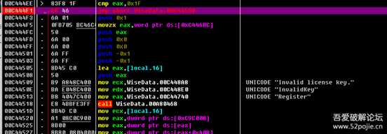 我们还可以在堆栈窗口,往下翻,会发现“注册码无效....”,紧接着下面有个返回到 WiseData.00C44534 来自 WiseData.00BC0070