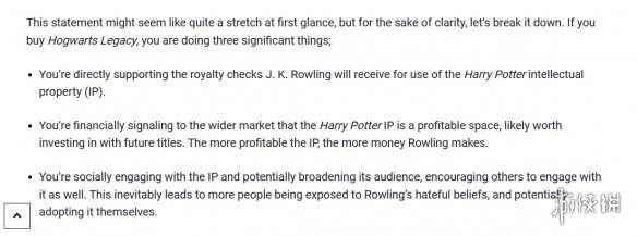 她/他 还声称 玩家购买游戏后会进行社交讨论,并有可能扩大游戏的受众,且可能会鼓励他人也参与其中,这不可避免地导致更多人接触到 罗琳的观点,无论购买了《霍格沃茨之遗》的玩家是否承认,这都是对跨性别群体的伤害。
