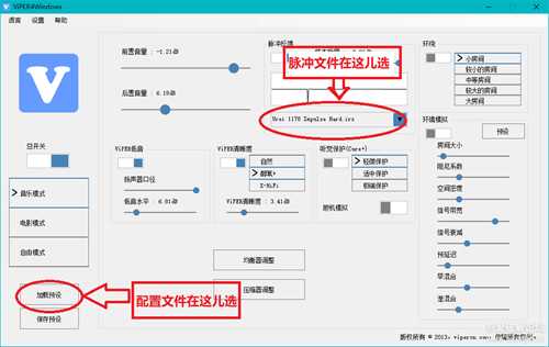 打开v4w客户端,脉冲文件在脉冲反馈选项下修改,配置文件在加载预设中修改,找到合适自己的音效开始享受“新音响”吧!