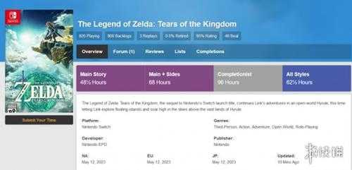 数据网站“HowLongToBeat”在今晚公开了《塞尔达传说:王国之泪》的平均通关时长,其中仅主线通关平均通关时长为48.5小时,全收集约为96小时。