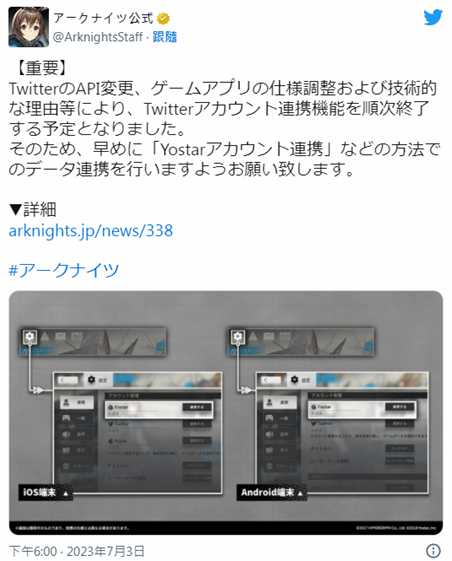 代理商Yostar宣布,日服《蔚蓝档案》、《碧蓝航线》、《明日方舟》和《雀魂》将关闭绑定推特的功能。