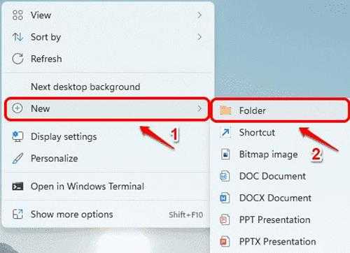 接下来,右键单击桌面上的任何空白区域,单击新建,然后单击文件夹以在桌面上创建一个新文件夹。