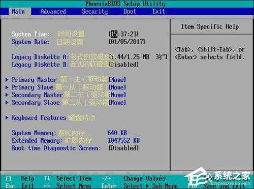 Main菜单:这里记录着电脑的主要信息,比如时间和日期,软盘现在已经不再使用,下面的驱动器中会记录电脑连接的硬盘信息,扩展内存就是电脑的物理内存大小,1024KB=1MB,1024MB=1GB。