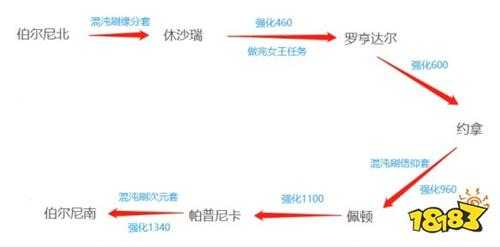 因命运方舟目前国服还没开,所以本攻略仅针对欧服。steam服由于版本等不同,不是很能适用。路线推荐伯尔尼北、混沌刷缘分套到休沙瑞、强化460、罗亨达尔、强化600、约拿、强化960、佩顿、强化1100、帕普尼卡、强化1340、伯尔尼男。