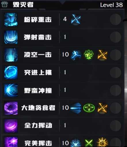 粉碎重击4点、弹射凿击1点、强力连击4点、凌空一击4点、突进上挑7点、野蛮冲撞4点、大地贪食者10点、全力挥动4点