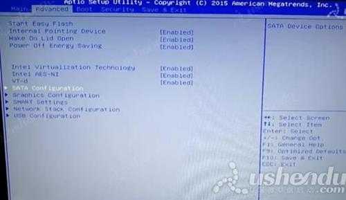 2.用方向键选择Advanced,选择到SATA Configuration。如图所示: