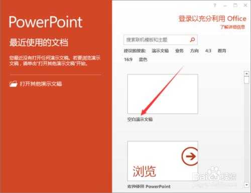 1、鼠标左键双击计算机桌面PowerPoint 2013演示文稿程序图标,将其打开运行。在打开的PowerPoint 2013程序窗口,点击“空白演示文稿”选项,新建一个空白PowerPoint演示文稿。如图所示;