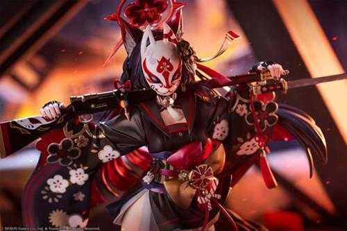来自《碧蓝档案》,被称为“灾难之狐”的女孩,狐坂若藻以游戏中的人设造型进行立体化。黑色的长发搭配上翘起的一对黑色狐耳,一张经典的狐狸面具遮盖着面容,一帮点缀着黑色花朵。黑色的水手服采用了和风元素,巨大的振袖上点缀着华丽的花朵,腰间也有着金红色的装饰,看上去十分华丽。一支黑色的步枪,护木上同样印有狐狸图案。制服裙摆之下,一双白皙长腿点缀着朋克风的腿环与吊带,一条大狐尾上也点缀着狐狸装饰与蝴蝶结。同时人偶附带有可爱的少女真面目表情替换件。
