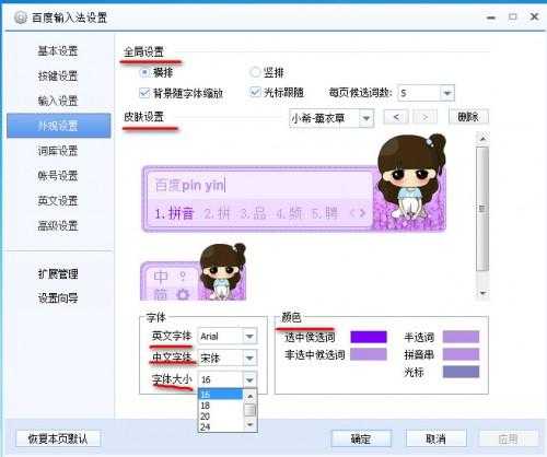 3、在外观设置中我们可以设置字体大小,颜色,皮肤设置等
