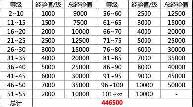 2-10级每级1000经验,11-15级每级1500经验,16-20级每级2000经验,21-25级每级2500经验,26-30级每级3000经验,31-35级每级4000,36-40级每级5000,41-45级每级6000经验,46-50级每级7000,51-55级每级2000经验,56-60级每级2500,61-65级每级3000经验,66-70级每级4000,71-75级每级5000经验,76-80级每级6000,81-85级每级7000经验,86-90级每级8000,91-95级每级9000,96-100级每级10000,100级以上每级10000。