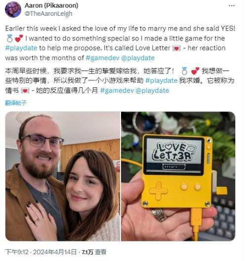 近日,前《盗贼之海》开发者Aaron在推特上分享了自己一生中的甜蜜时刻——他向女友成功求婚了,并且用的是游戏开发者独有的方式。