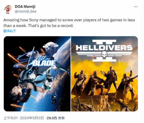 就在几天前,《剑星》遇到了首发和谐的问题,这款游戏同样是SIE发行的作品。