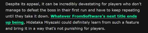 虽然有一些玩家对其持怀疑态度,认为时间限制可能会导致很多玩家完全错过第二阶段,而第二阶段对于游戏的进展至关重要。但媒体认为这是一个非常有趣的机制,具有惊人的潜力,能带来更进一步的挑战。作者还认为魂系类型的创造者宫崎英高可以在其未来的作品中借鉴这种机制,并以一种不让玩家感到痛苦的方式将其引入游戏。