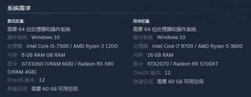最低配置要求的显卡GTX1060 (VRAM 6GB),推荐配置显卡是RTX2070,游戏容量还是不小的,空间需要60 GB 可用空间。