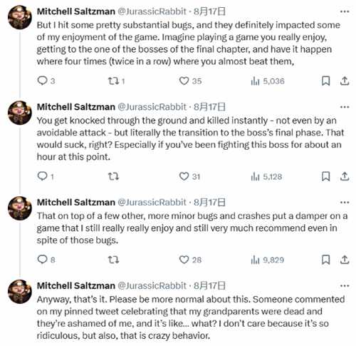 他表示自己在测评时确实遇到了一些BUG,影响了自己的游戏体验,尤其是这种情况发生了4次(有两次连续发生),而当时距离他击败BOSS只差一点点了。