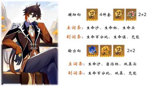 备注:如果钟离是0命,则4千岩可能会存在不能稳定触发的情况,因为钟离同时只能创造一个岩造物,当然,即使是1命,能同时创造两个岩造物,在某些场地,如纯水精灵的挑战地点,因为本身地形限制不允许创造岩造物,或者某些敌人(若陀龙王等)可以破坏岩造物的情况下,4千岩也不能稳定触发,因此纯粹的辅助向钟离多数情况下更适合2千岩+2花海,稳定的40%生命值提升,我个人更推荐旅行者将钟离当作辅助使用,当然旅行者非常喜欢用钟离,则可以输出向使用