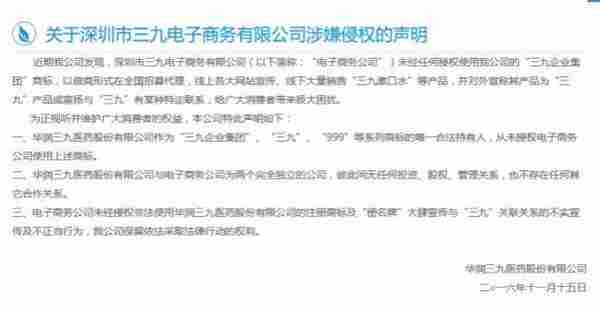 “近期我公司发现,深圳市三九电子商务有限公司未经任何授权使用我公司的‘三九企业集团’商标,以微商形式在全国招募代理,线上各大网站宣传、线下大量销售‘三九漱口水’等产品,并对外宣称其产品为‘三九’产品或宣扬与‘三九’有某种特定联系,给广大消费者带来极大困扰。”近期,华润三九在官网发布了一条这样的声明。