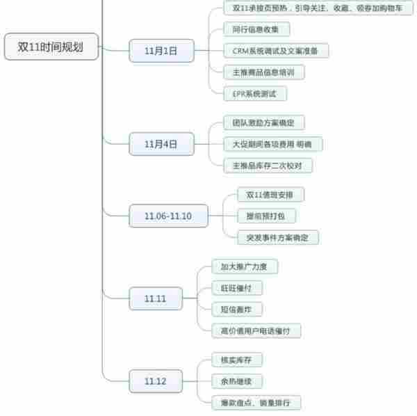 运营和店长的主要工作就是把控节奏,协调好所有的时间节点和各类需求,让团队人员都明确自己该做好什么事。用一张脑图把控好整个双十一时间节点